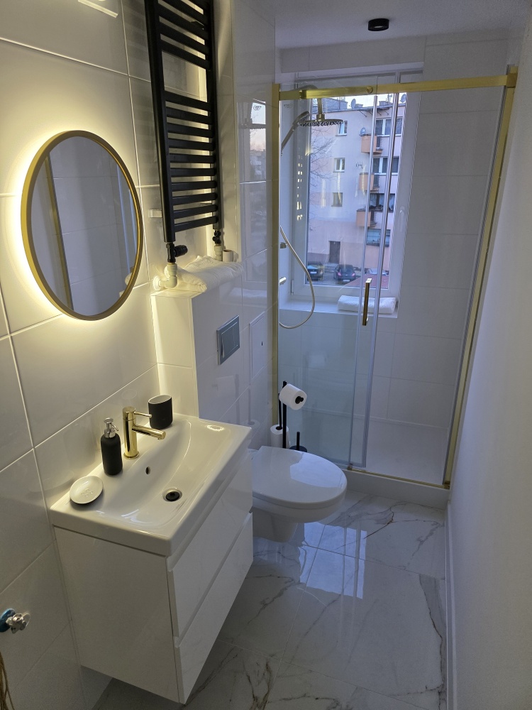 – łazienka: wykafelkowana, prysznic, umywalka z szafką i lustrem podświetlanym, armatura w kolorze złotym,