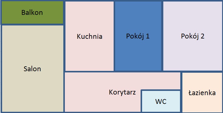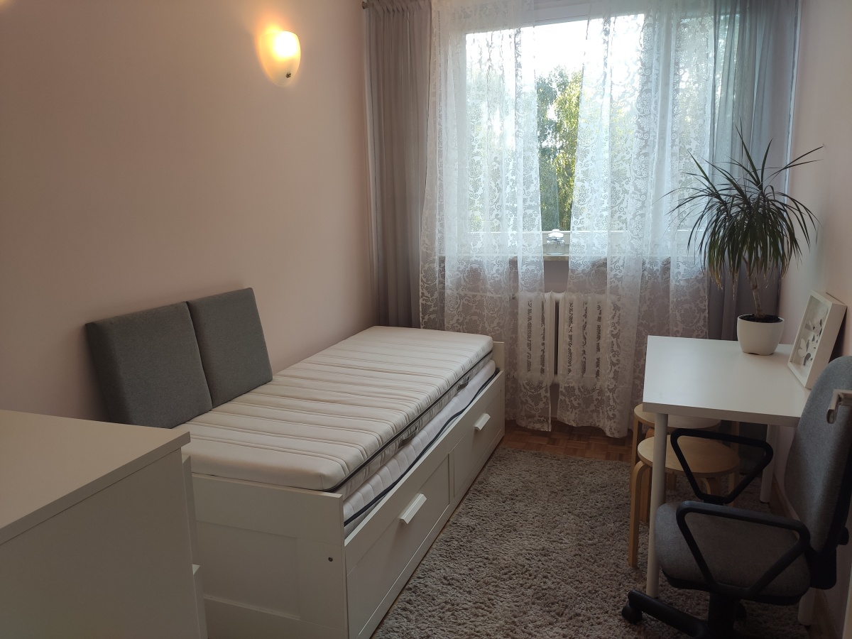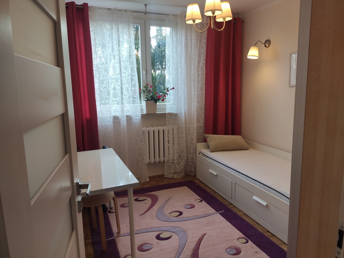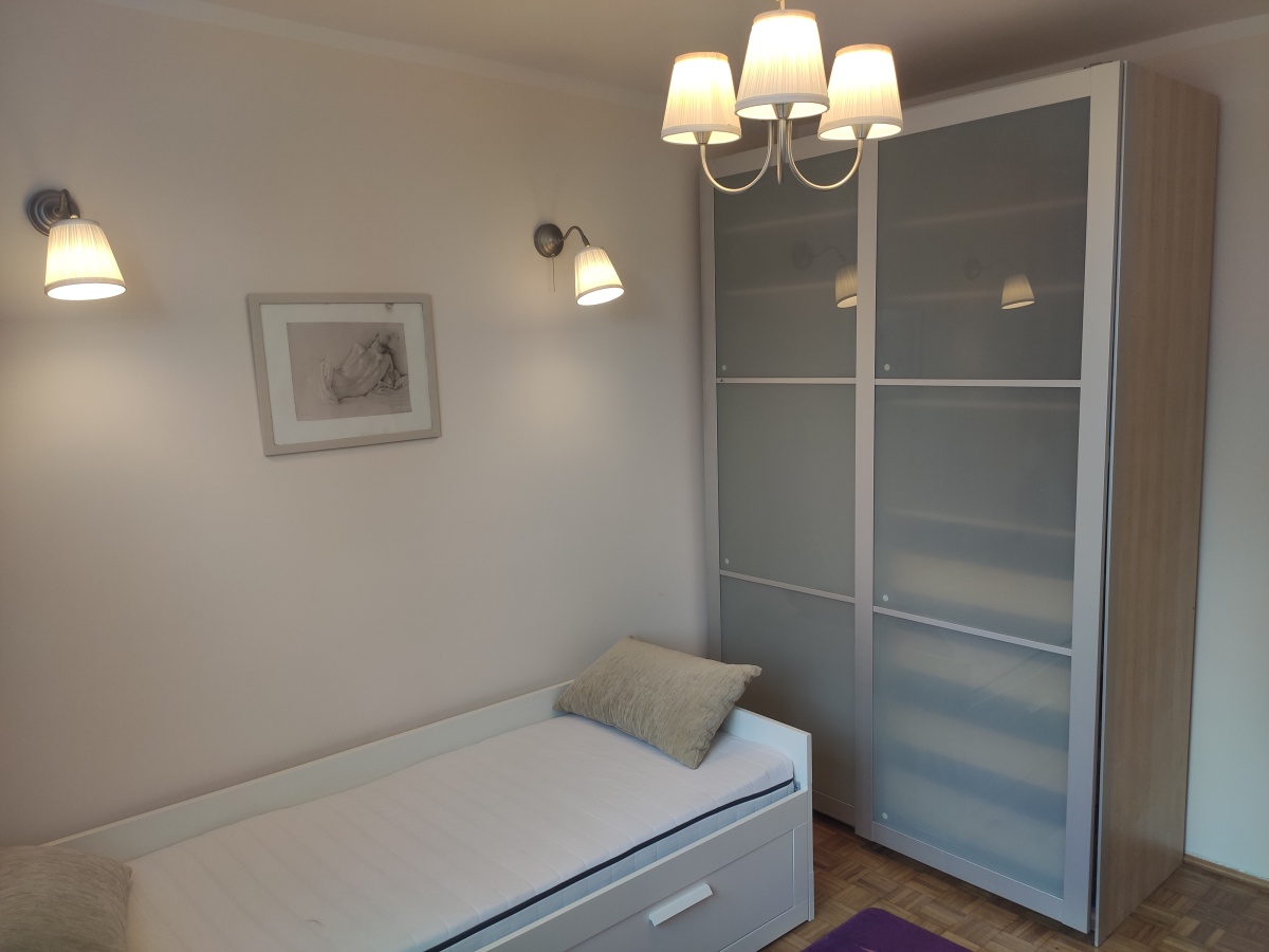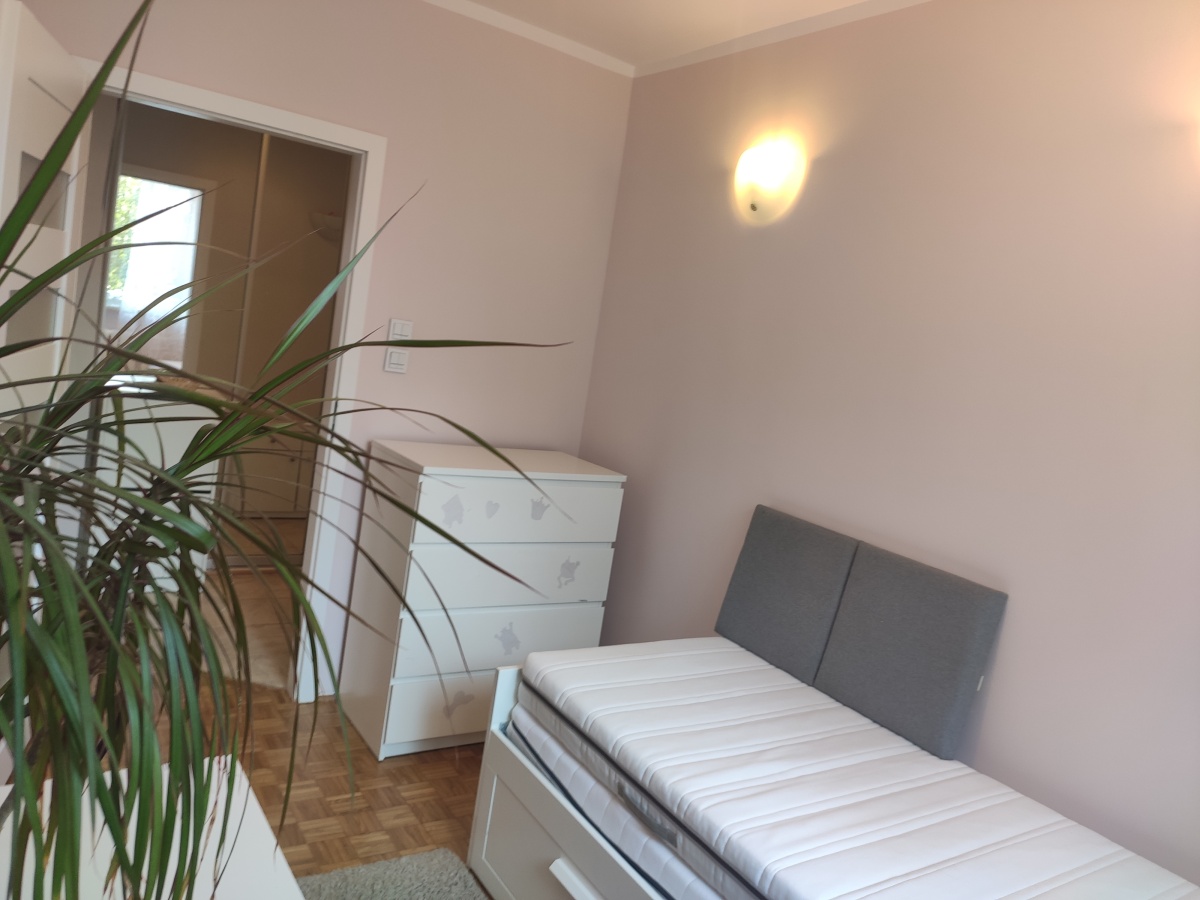 Trzy niezależne pokoje. W każdym łóżko które można rozsunąć do dwuosobowego. W większym pokoju przestronna szafa z drzwiami przesuwanymi. W największym pokoju loggia ok. 4 m.