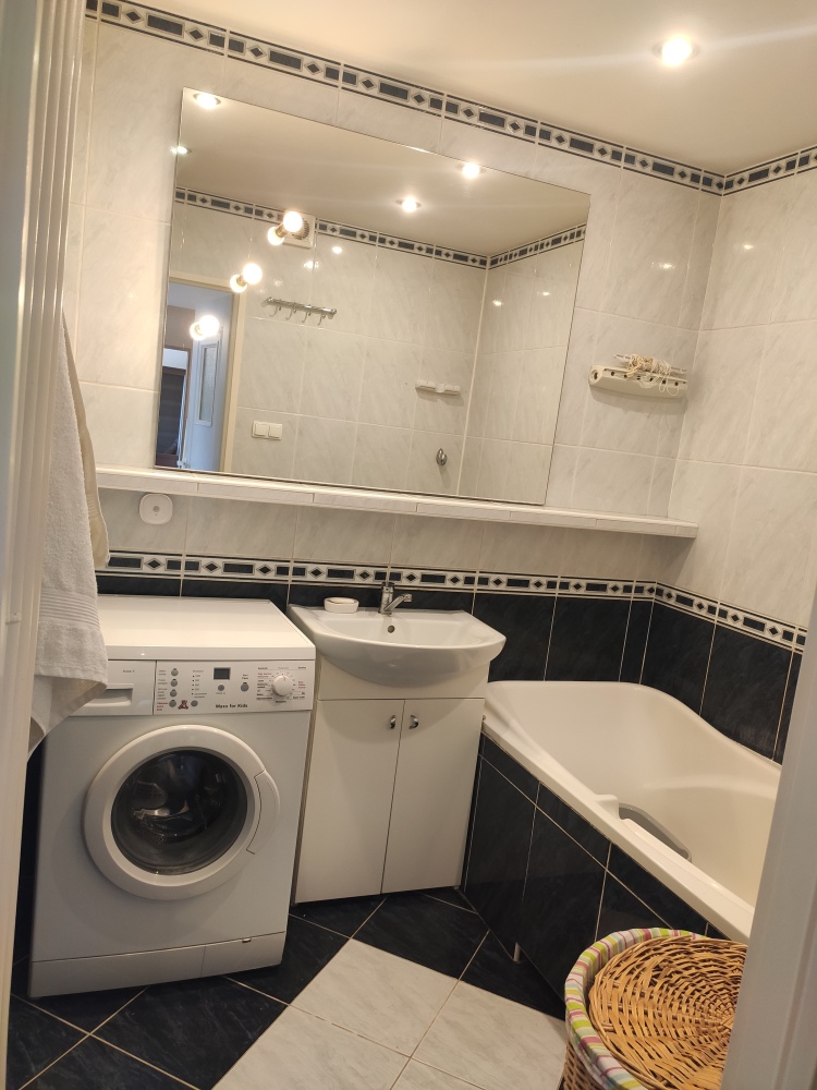 Przestronna łazienka z wanną. Wykończona glazurą i terakotą, pralka