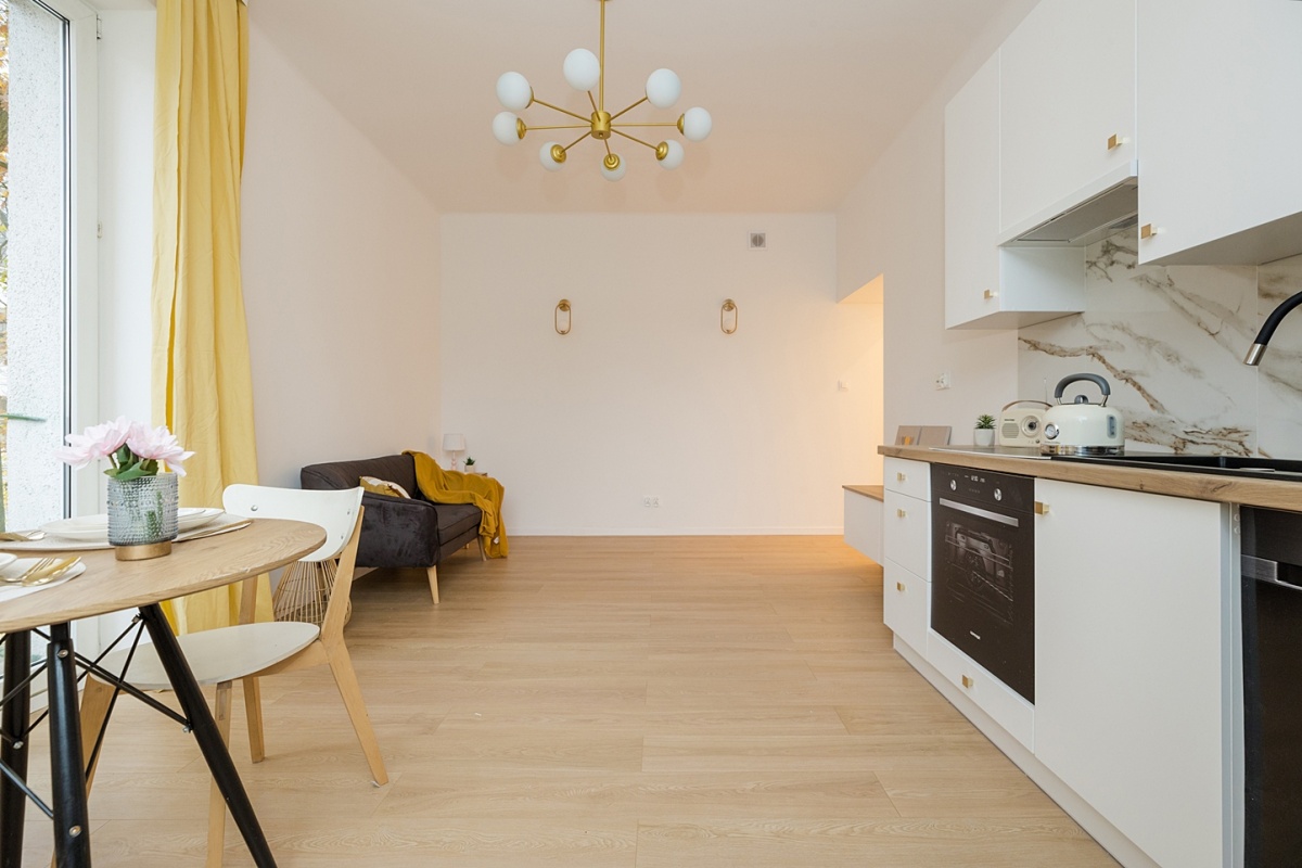 Lokal sprzedawany w standardzie "pod klucz" – w pełni wykończony, gotowy do zamieszkania lub wynajmu. W cenie zawarta jest estetyczna zabudowa kuchenna (bez AGD) oraz pełne wykończenie wnętrz. Meble ruchome nie są objęte ceną.