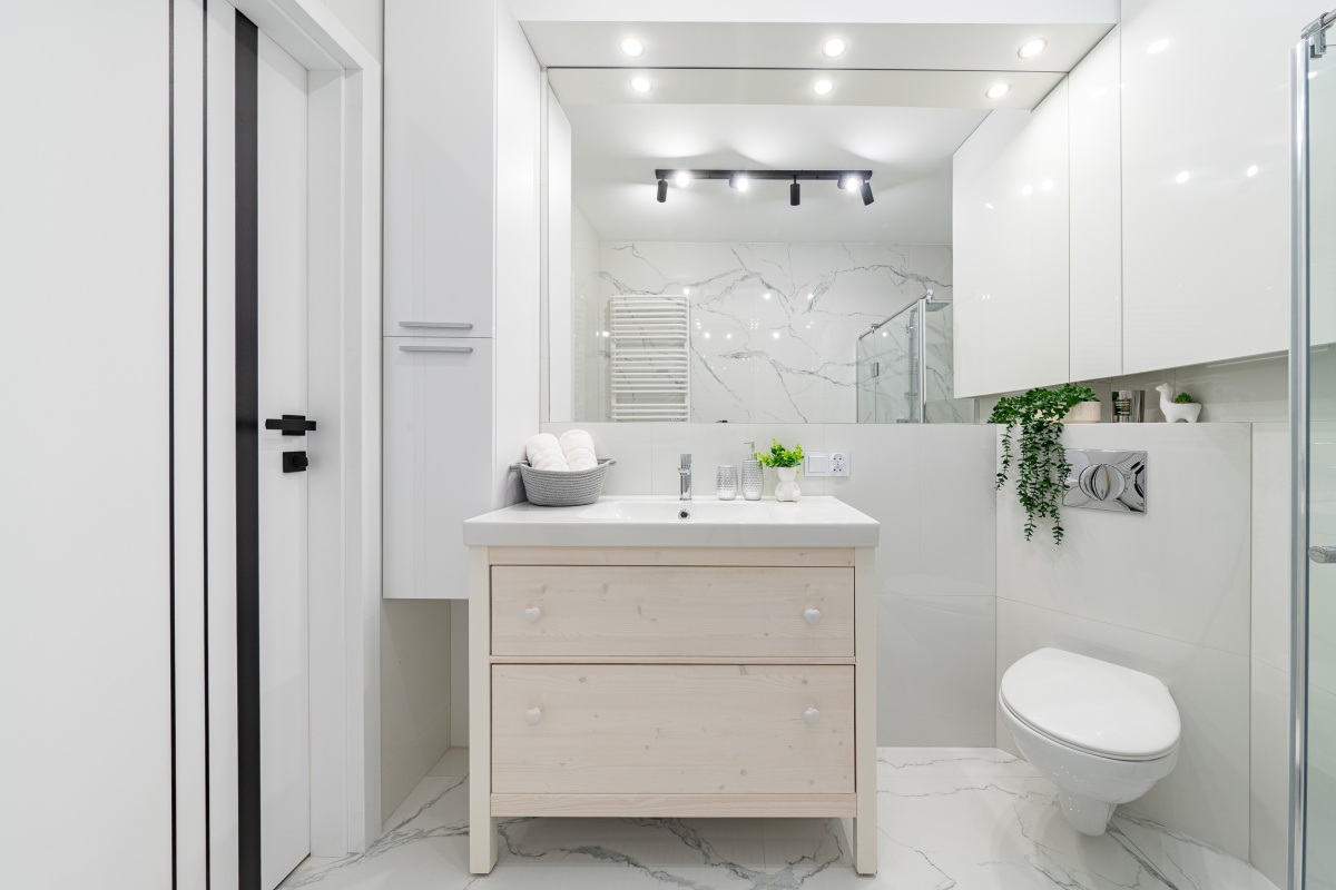 Łazienka: piękna glazura, która ma unikatowy połączony ze sobą wzór marmuru, który jest połączony w jednej całości. Duża szafka z umywalką, słupek łazienkowy do przechowywania kosmetyków, prysznic z odpływem liniowym oraz wc.
