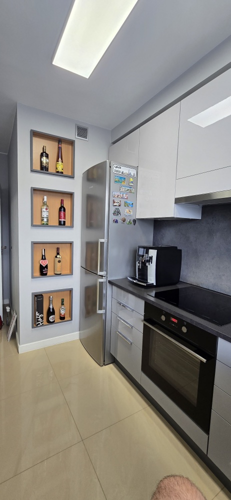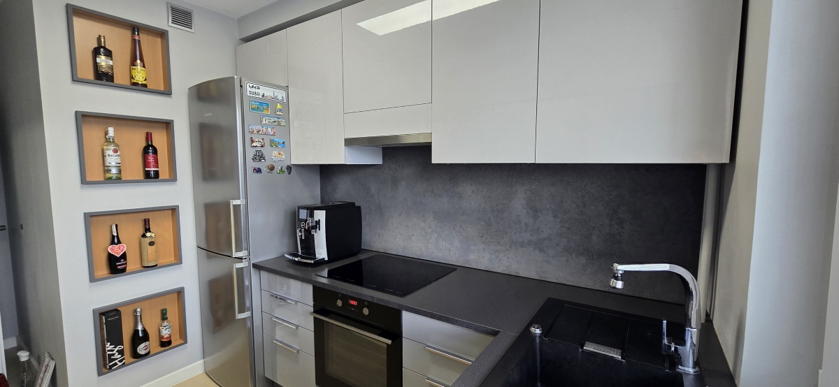 Nowe AGD, Szafki w Lakierowanych frontach, zabudowa przygotowana pod zmywarkę.