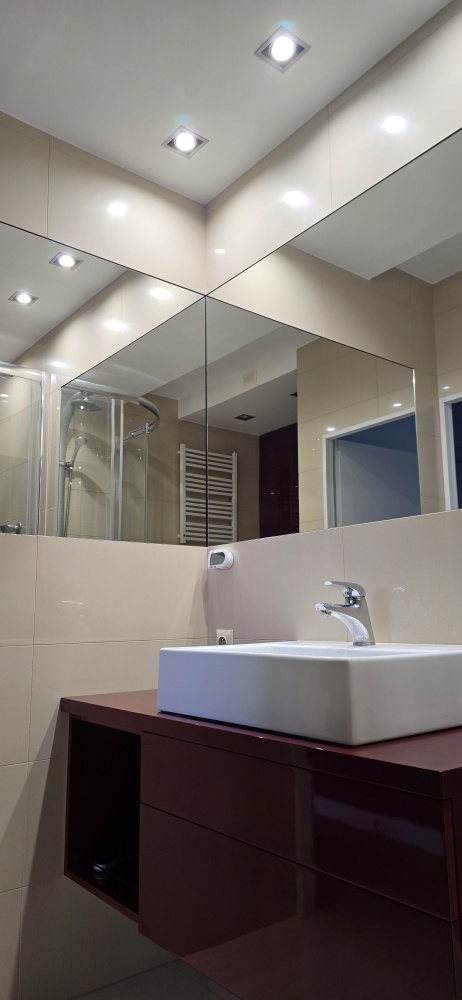 Duża łazienka z dwiema taflami luster, meble lakierowane wc podtynkowe, gres na ścianach i podłodze.