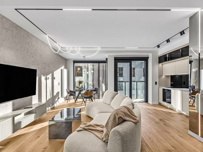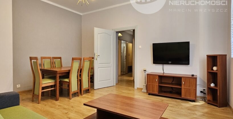 Na 44m2 składają się: umeblowany salon, pokój z wejściem do wyposażonej kuchni, wyposażona łazienka i korytarz z wieloma szafami.