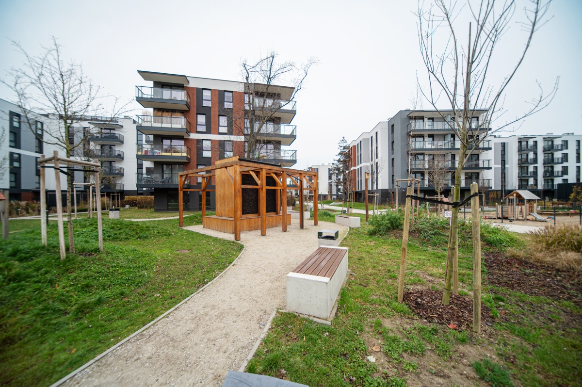 Osiedle bardzo ładnie urządzone, tereny wspólne urozmaicają m.in. tarasy pełniące funkcje ogrodów, tężnia solankowa, siłownia na świeżym powietrzu , place zabaw , tereny relaksowe.