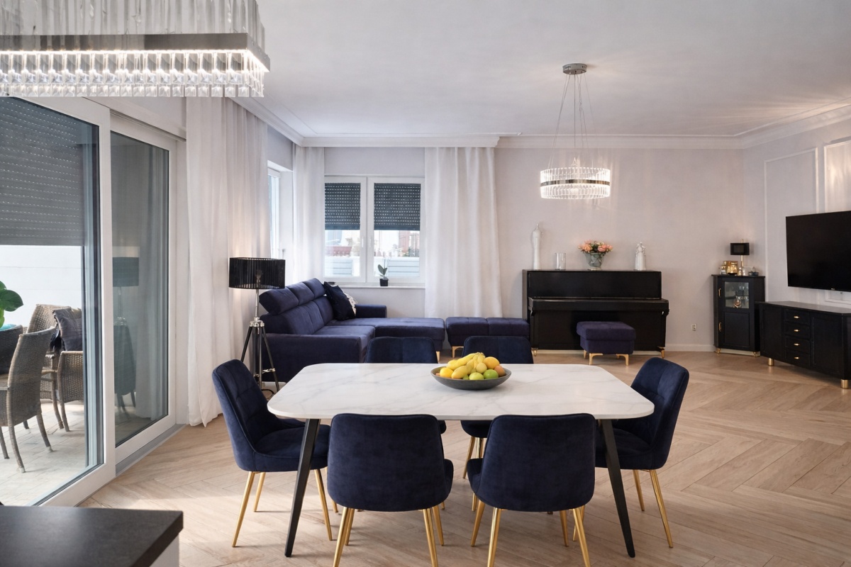 Przestronny, doświetlony salon z aneksem kuchennym to klasyka w nowoczesnym i wyrafinowanym wydaniu. Zastosowano prostą neutralna bazę: jasne podłogi (gresy) i ściany oraz kilka antycznych, mocnych akcentów. Sufity zdobi sztukateria.