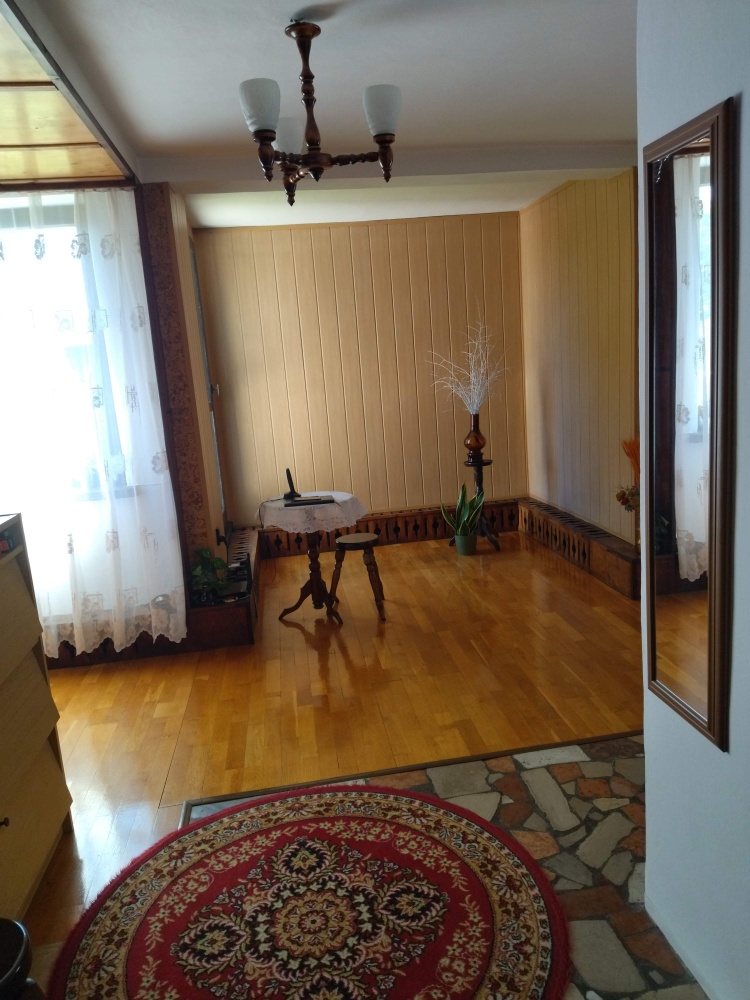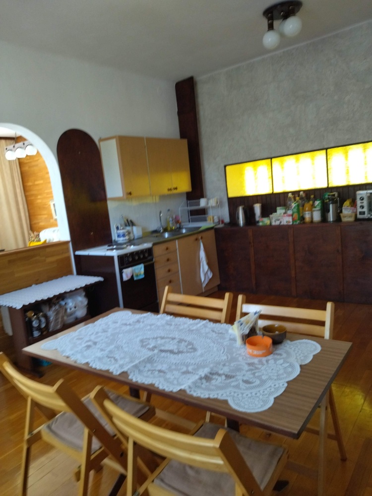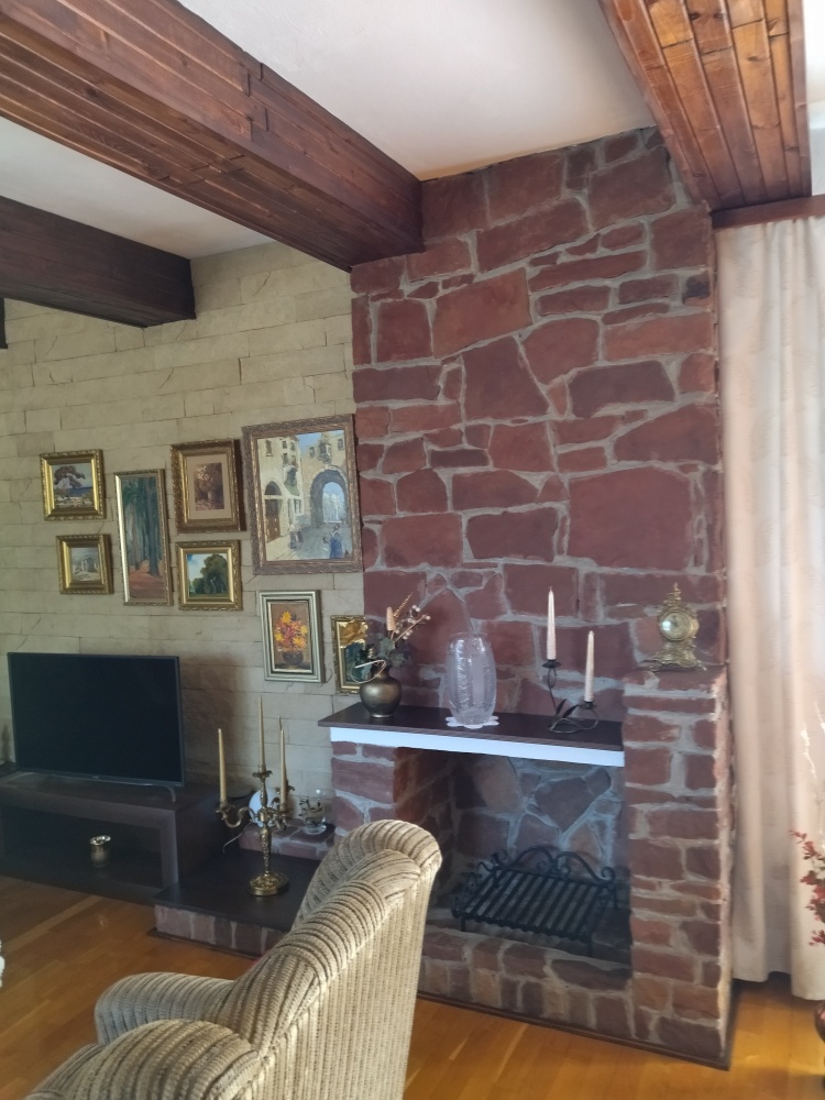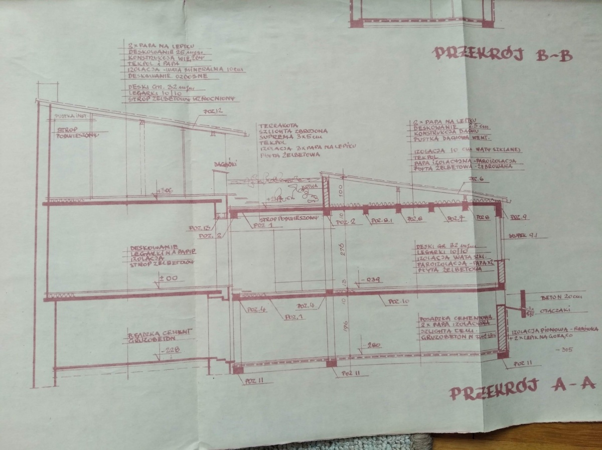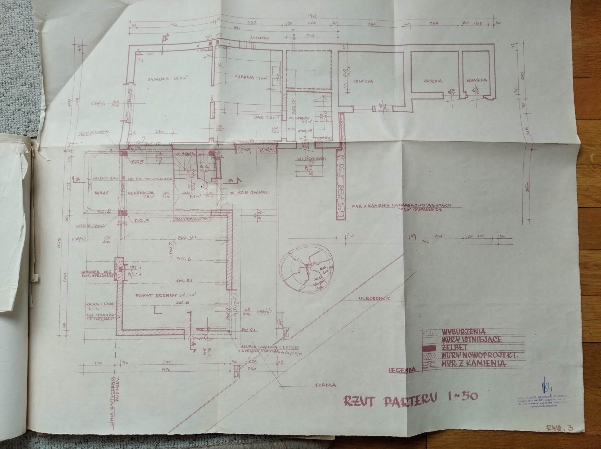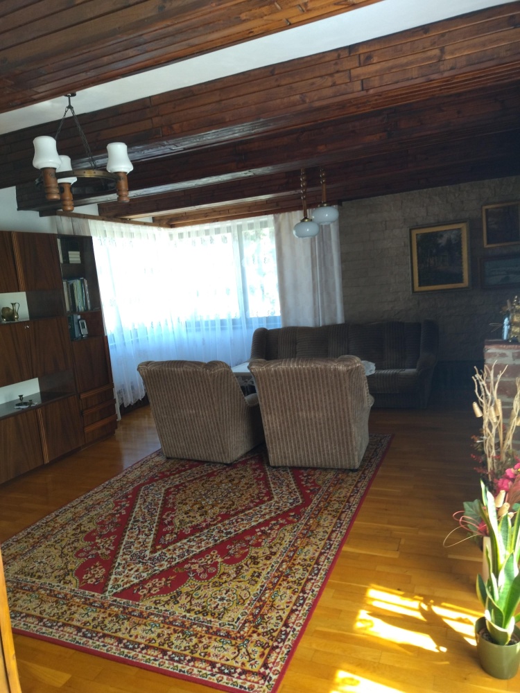 – parter: hol, toaleta, salon z kominkiem wykonanym z czerwonego pisakowca, jadalnia połączona z kuchnią,
