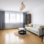 przestronny salon z dużymi przeszkleniami i wyjściem na taras