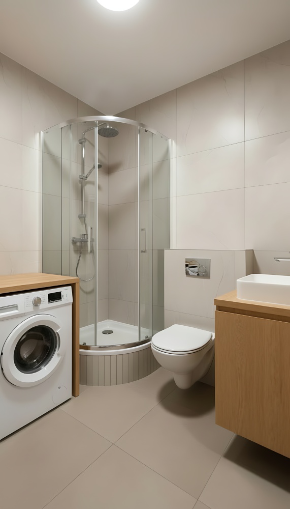 • Łazienka z kabiną prysznicową i miejscem na pralkę, w nowoczesnym, neutralnym wykończeniu.