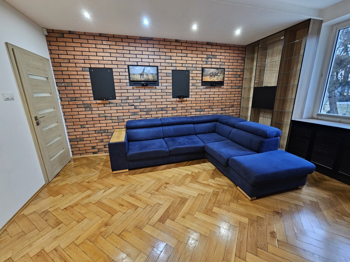 W salonie znajduje się kanapa, biblioteczka oraz szafka RTV. Wszystkie te meble zostały zrobione na wymiar. Na wyróżnienie zasługuje drewniana podłoga oraz ściana z cegłą z czterema miejscami na zdjęcia dużego formatu.