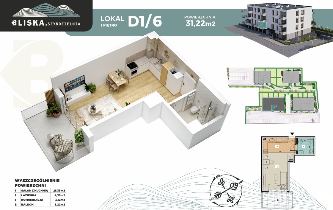Prezentujemy lokal D1/06 w prestiżowej inwestycji Bliska Szyndzielnia w Bielsku-Białej. To idealna propozycja dla inwestorów poszukujących nieruchomości w segmencie "małych metraży", który generuje najwyższą rentowność zarówno w najmie krótko-, jak i długoterminowym.