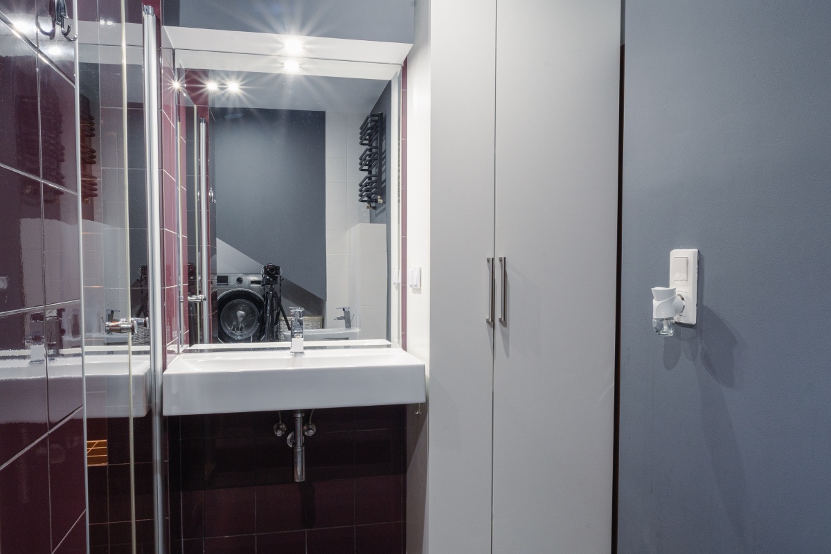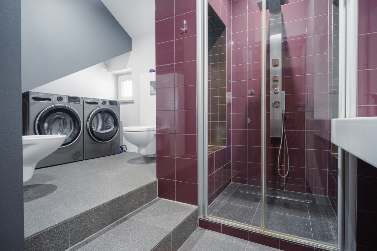Łazienka z wc(7 m²) – z wybudowanym prysznicem, bidetem dużą umywalką, szafą na ręczniki, chemię i kosmetyki i miejscem na pralkę oraz suszarkę