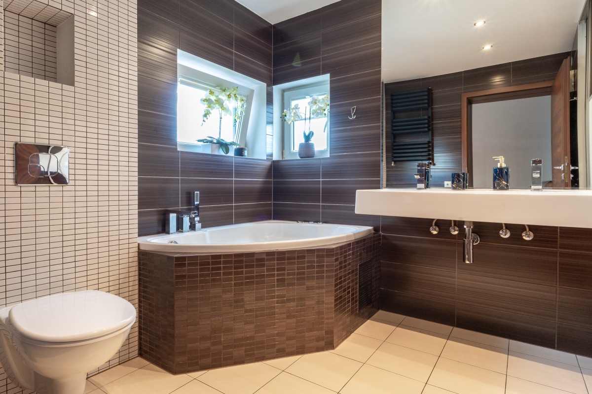 Łazienka (4,65 m²) – z podwójną umywalką, dwoma oknami, wnękową szafą i wanną z jacuzzi