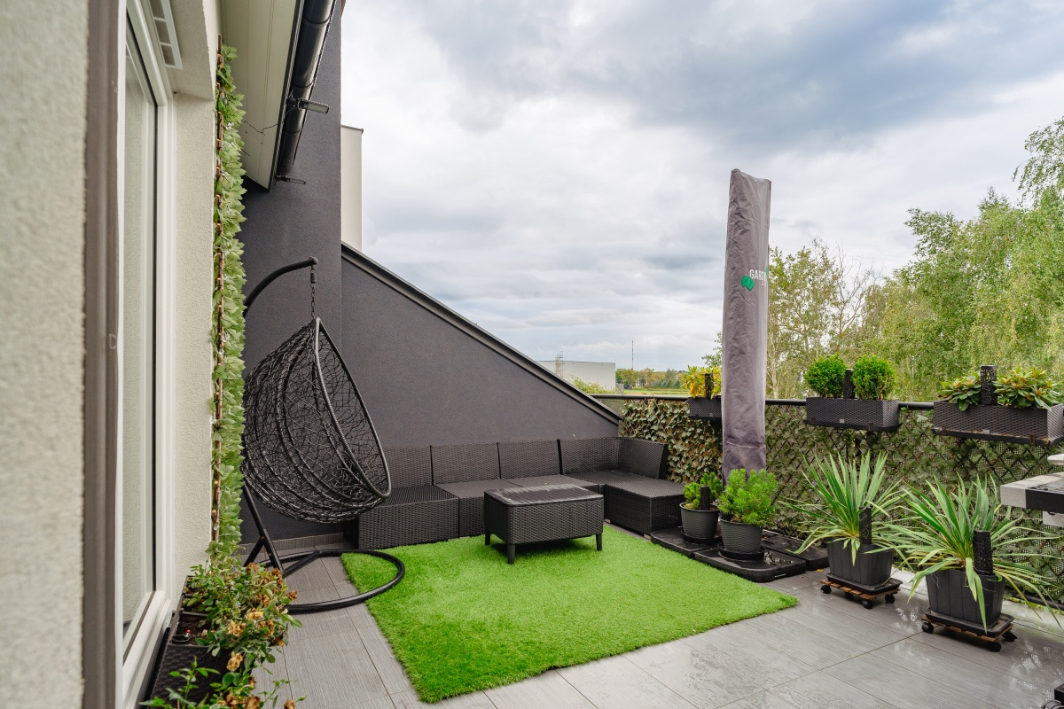 Taras (ok. 30 m²) – ekspozycja południowo-zachodnia, częściowo zadaszony