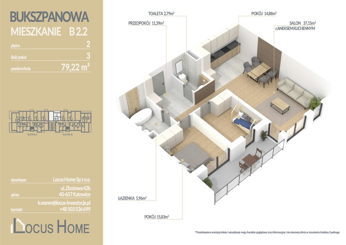 Przedstawiamy ofertę mieszkania 3 – pokojowego o powierzchni 79,00 m² z balkonem, zlokalizowanego na drugim piętrze budynku, oznaczonego nr B 2.2