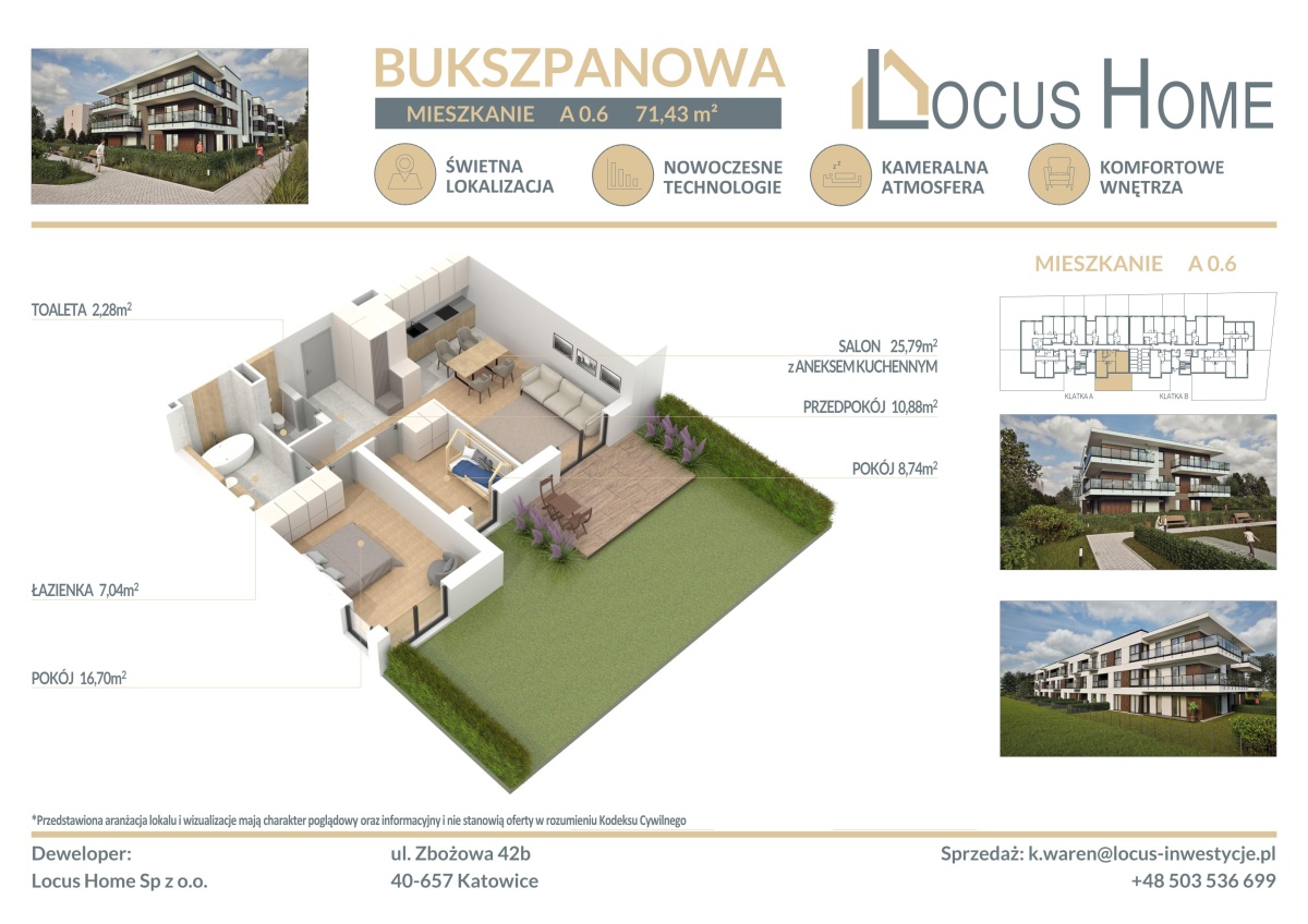 Spółka LOCUS HOME to DEWELOPER który realizuje inwestycje mieszkaniowe na terenie Katowic od wielu lat. NOWA inwestycja na ulicy BUKSZPANOWEJ (obok nr 19) w Piotrowicach to nowoczesny apartamentowiec w doskonałej lokalizacji Katowic.