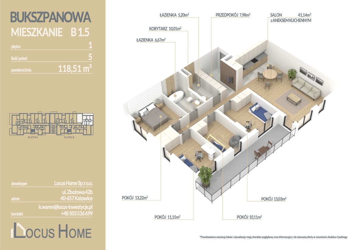 Przedstawiamy ofertę mieszkania 5 – pokojowego o powierzchni 118,51 m² z balkonem, zlokalizowanego na pierwszym piętrze budynku, oznaczonego nr B 1.5
