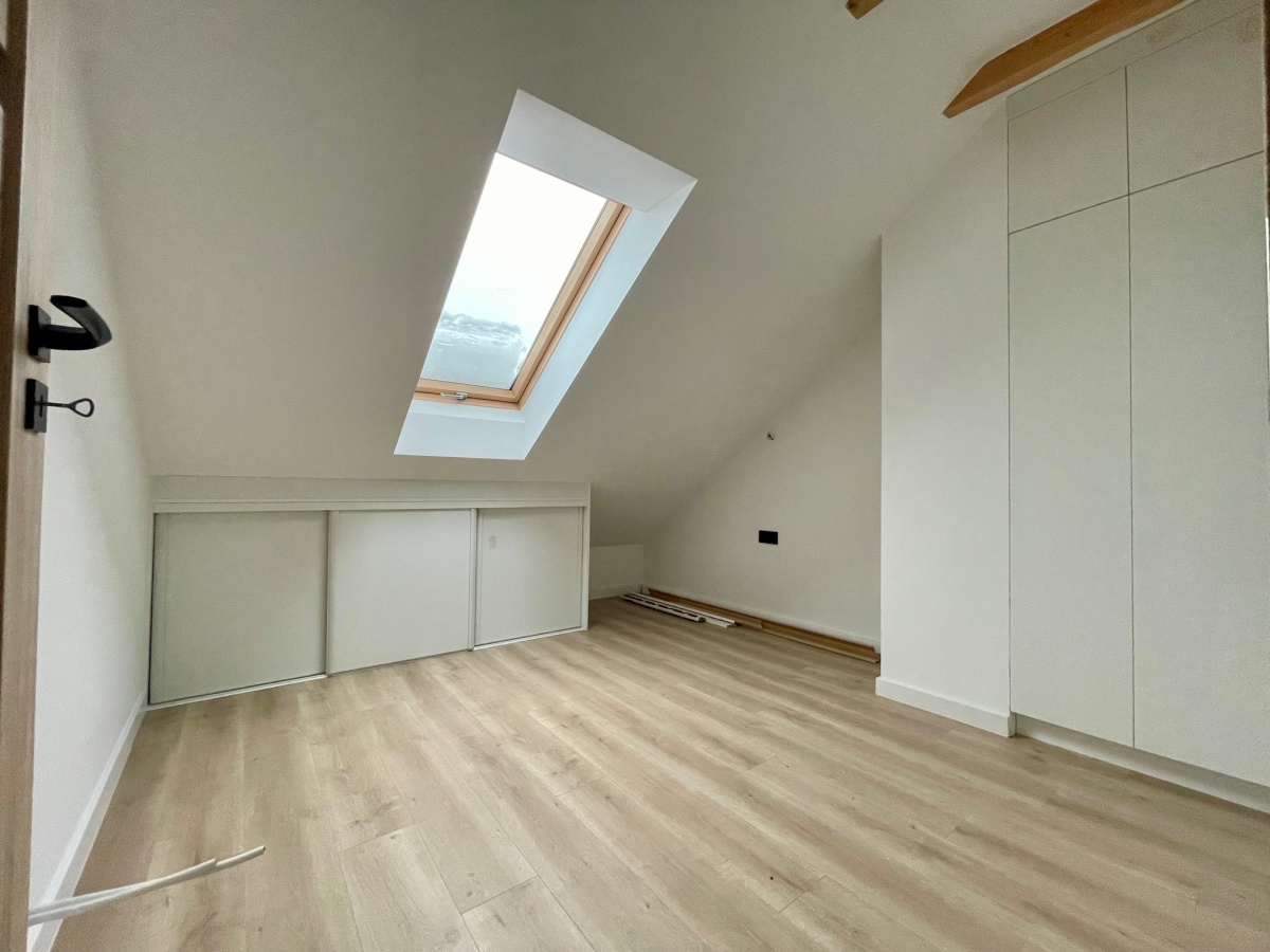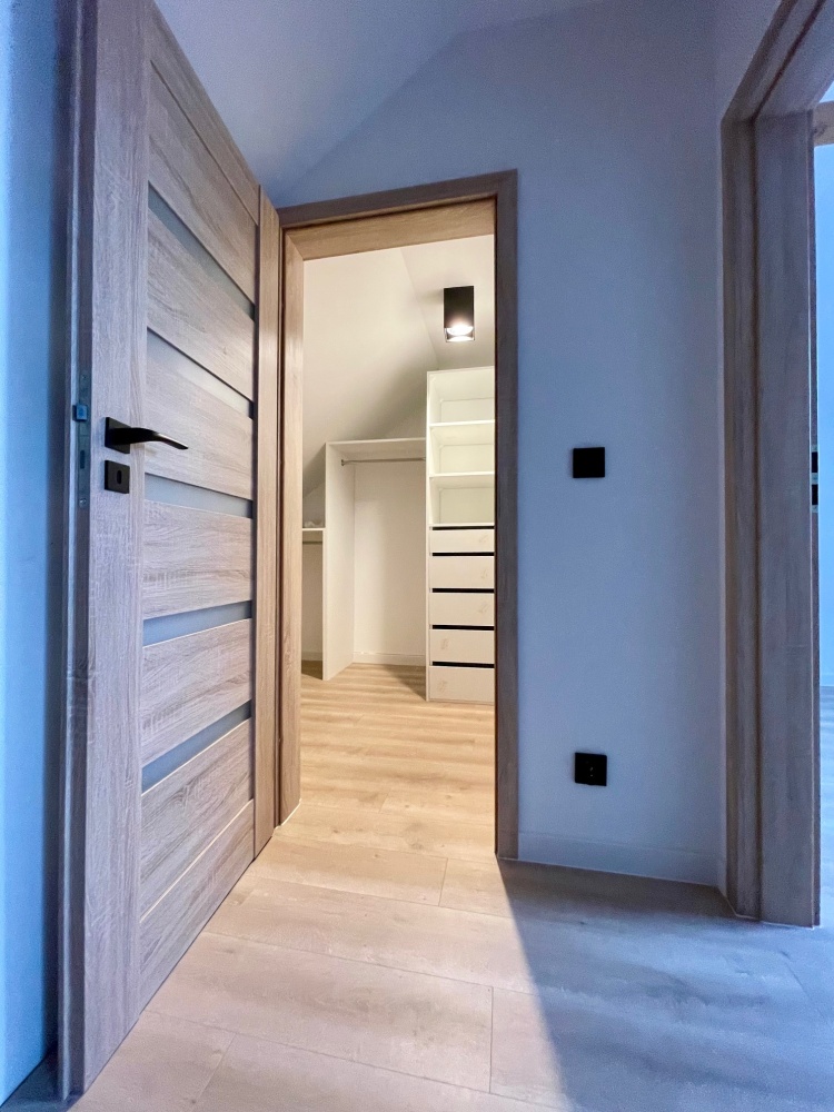 Na poddaszu mieszczą się dwa pokoje, garderoba i łazienka.