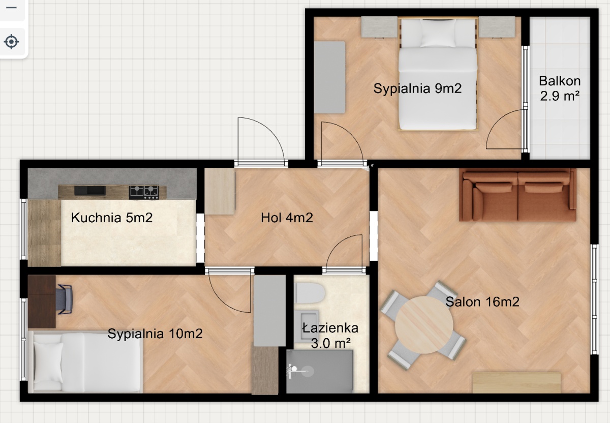 Układ: ustawny salon (15m2), sypialnia (9m2) z wygodną loggią, pokój (10m2), kuchnia (5m2), łazienka (3m2) oraz przedpokój (4m2). Do mieszkania przynależy piwnica. Mieszkanie dwustronne (północ-południe), jasne, oddalone od ulicy.