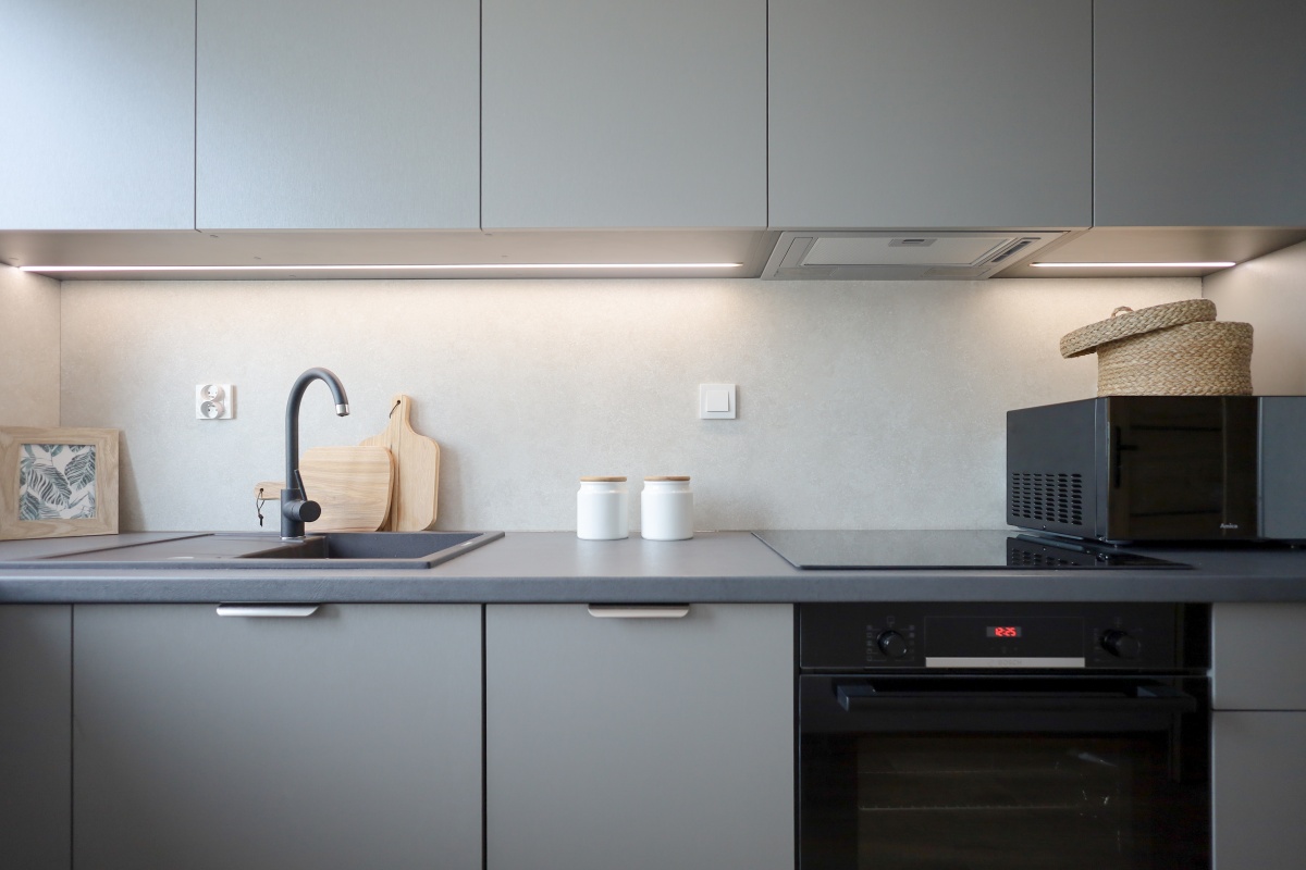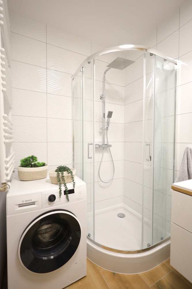 W pełni wyposażone: pralka, zmywarka, piekarnik, mikrofala — wszystko gotowe do wprowadzenia.