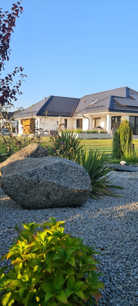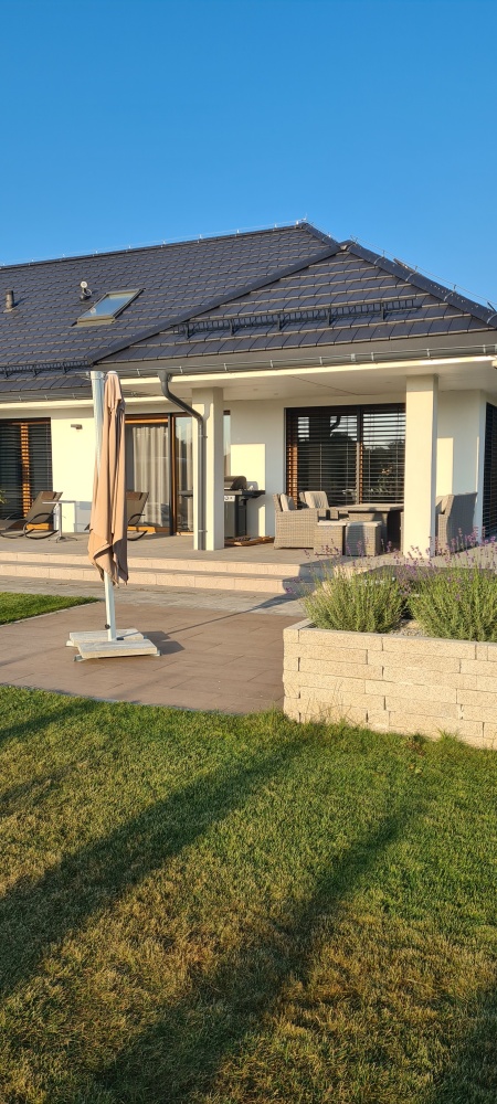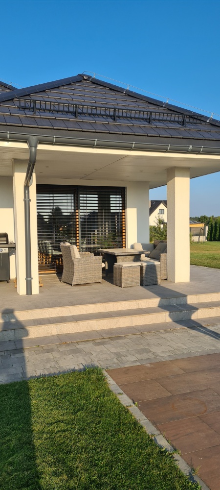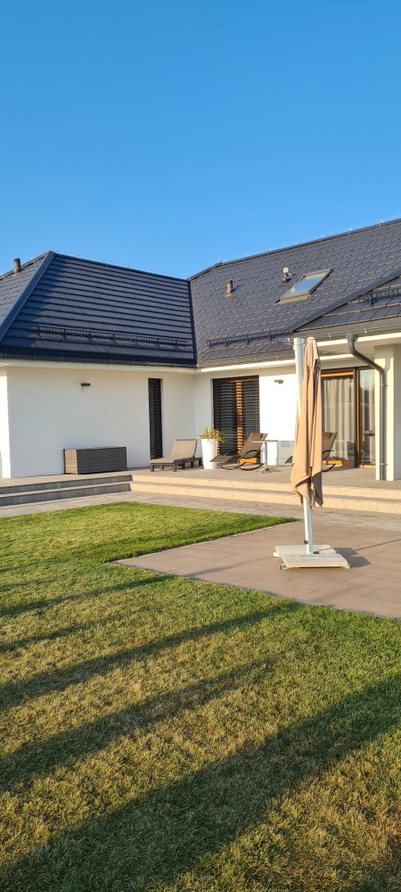Wysoka jakość wykończenia wnętrz: salon z 3 przesuwnymi oknami prowadzącymi na ogród, przestronna kuchnia, spiżarnia, 4 pokoje, garderoba, łazienka, pralnia, toaleta, szatnia oraz wiatrołap.