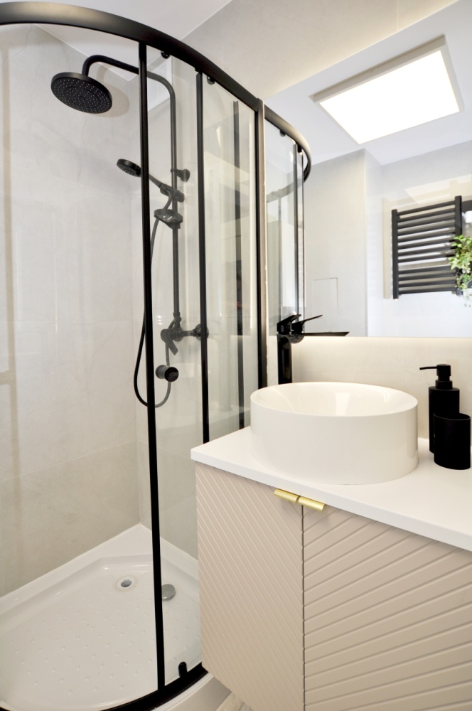 Kabina z deszczownicą, zabudowa meblowa, elegancka armatura – komfort na co dzień.