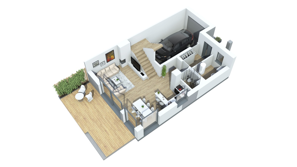 Pięć pokoi + dwie łazienki + garaż na poziomie parteru – komfortowa przestrzeń dla rodziny.