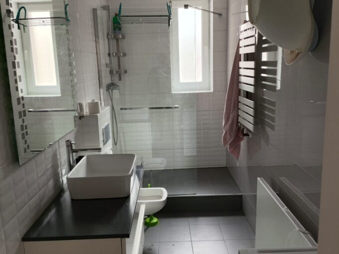* Łazienka: wyposażenie- prysznic, na podłodze – płytki,