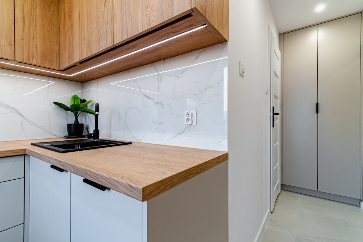 – Nowe meble na wymiar od stolarza (kuchnia, 2 szafy w przedpokoju, szafka z umywalką w łazience)