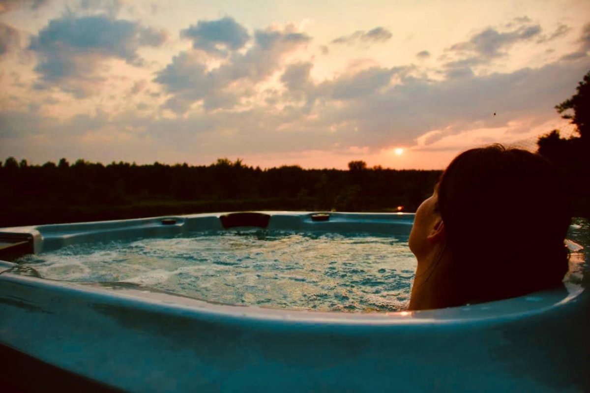 Strefa Relaksu: Jacuzzi z widokiem na Bug, strefa medytacji wśród zieleni, taras i ogród schodzący prosto do wody.