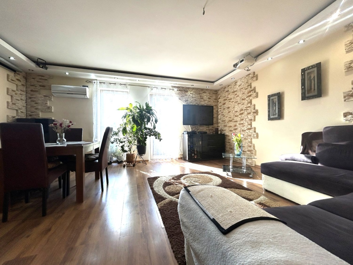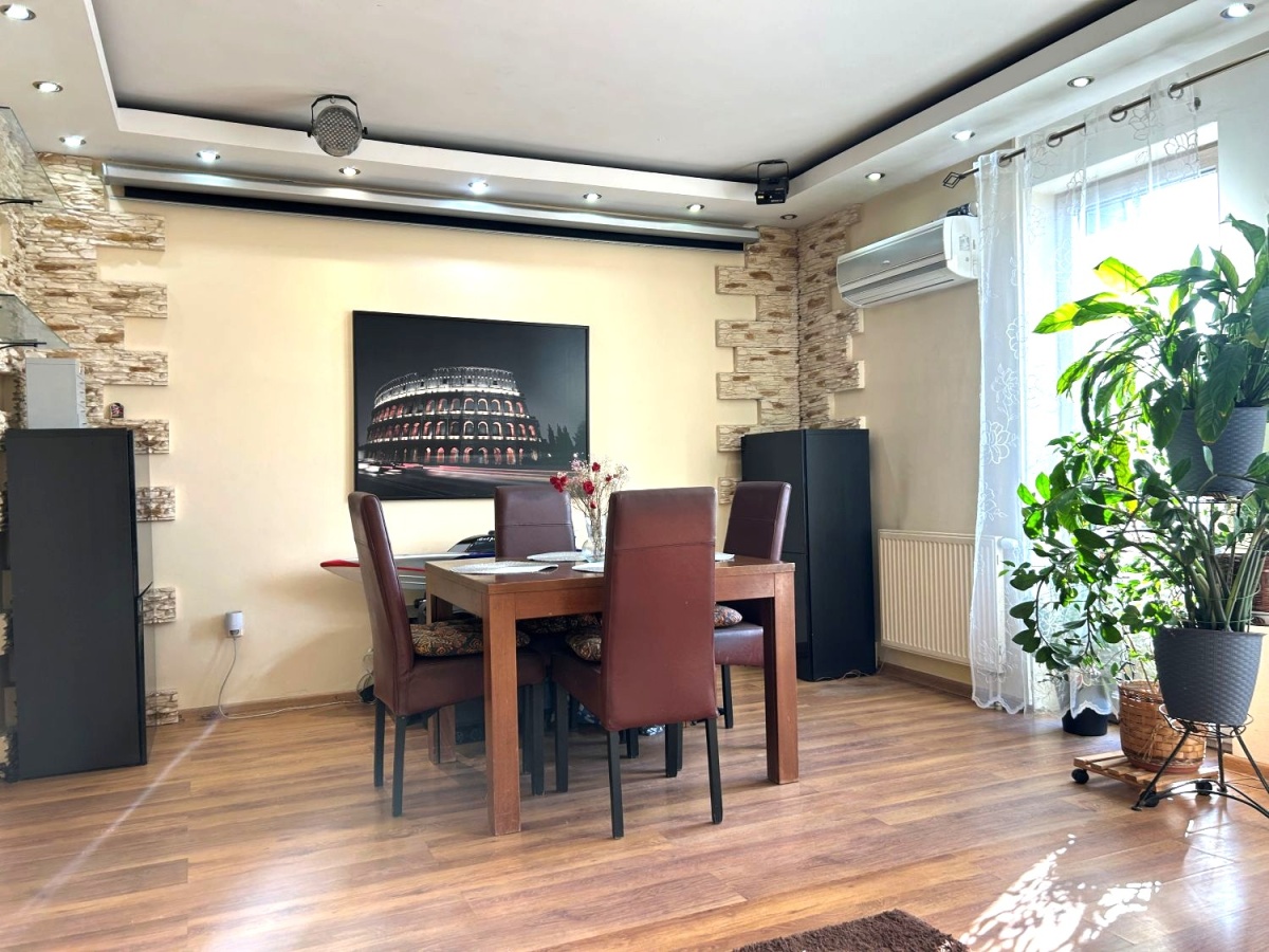 Na dole jest duży salon z aneksem kuchennym (34m2), oraz schowek pod schodami (4m2). Na górze do dyspozycji są dwa pokoje (12 i 15m2) oraz łazienka (ok 5m2). Okna w salonie zostały wymienione 3 lata temu, a dachowe pół roku temu (trzyszybowe).