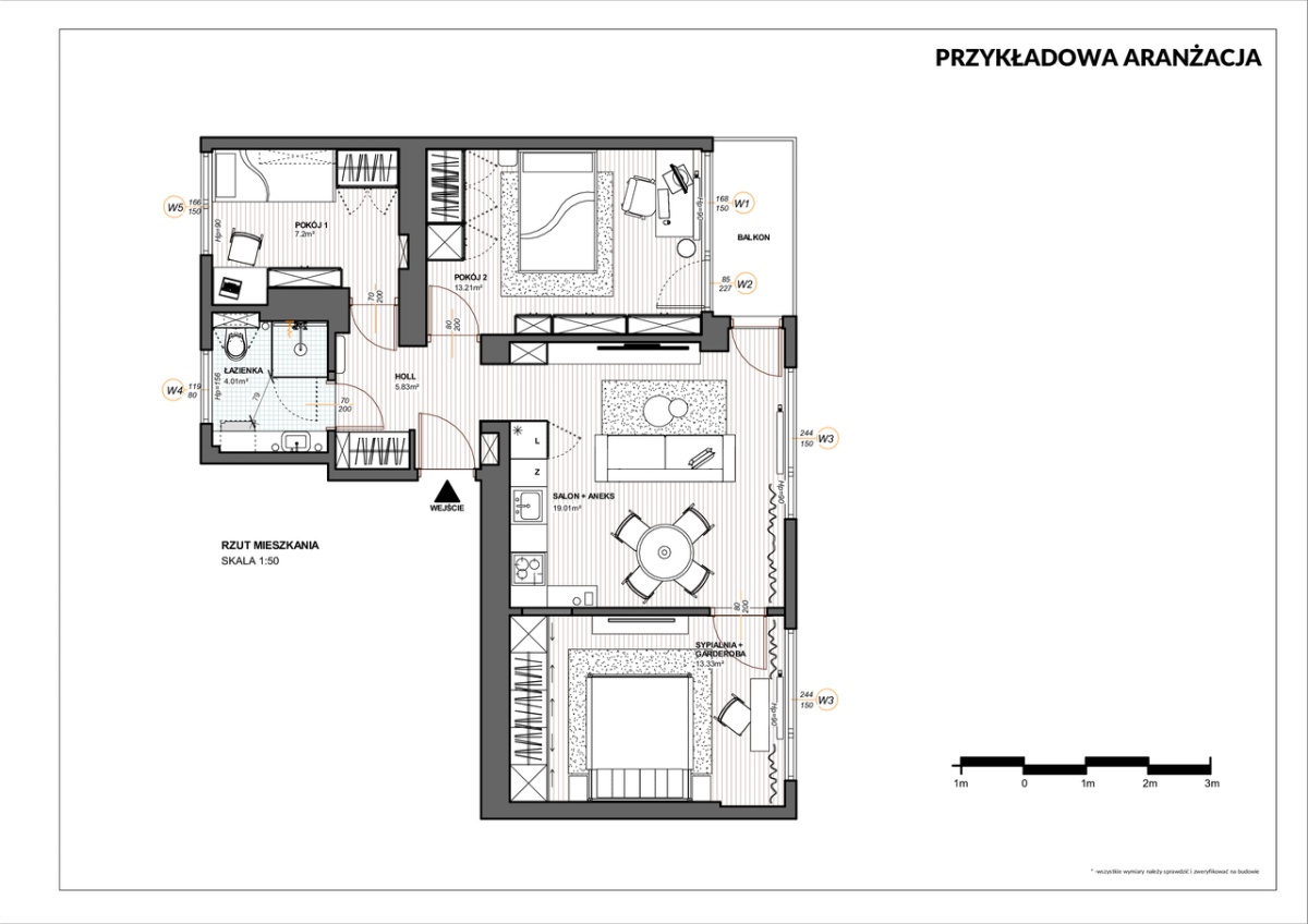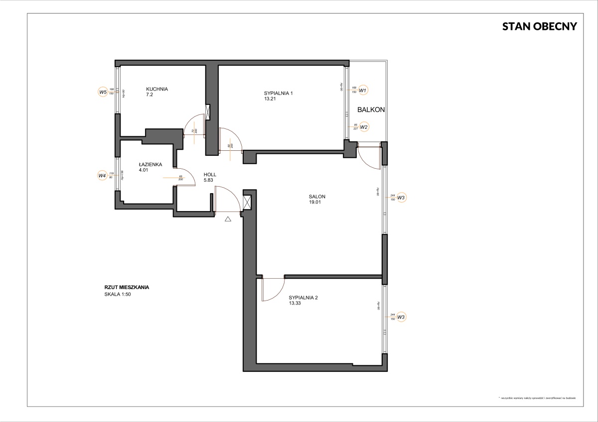 Potencjał mieszkania- możliwość pozostawienia obecnego układu z oddzielną kuchnią lub zmiany na mieszkanie z 3 sypialniami i salonem z aneksem kuchennym.