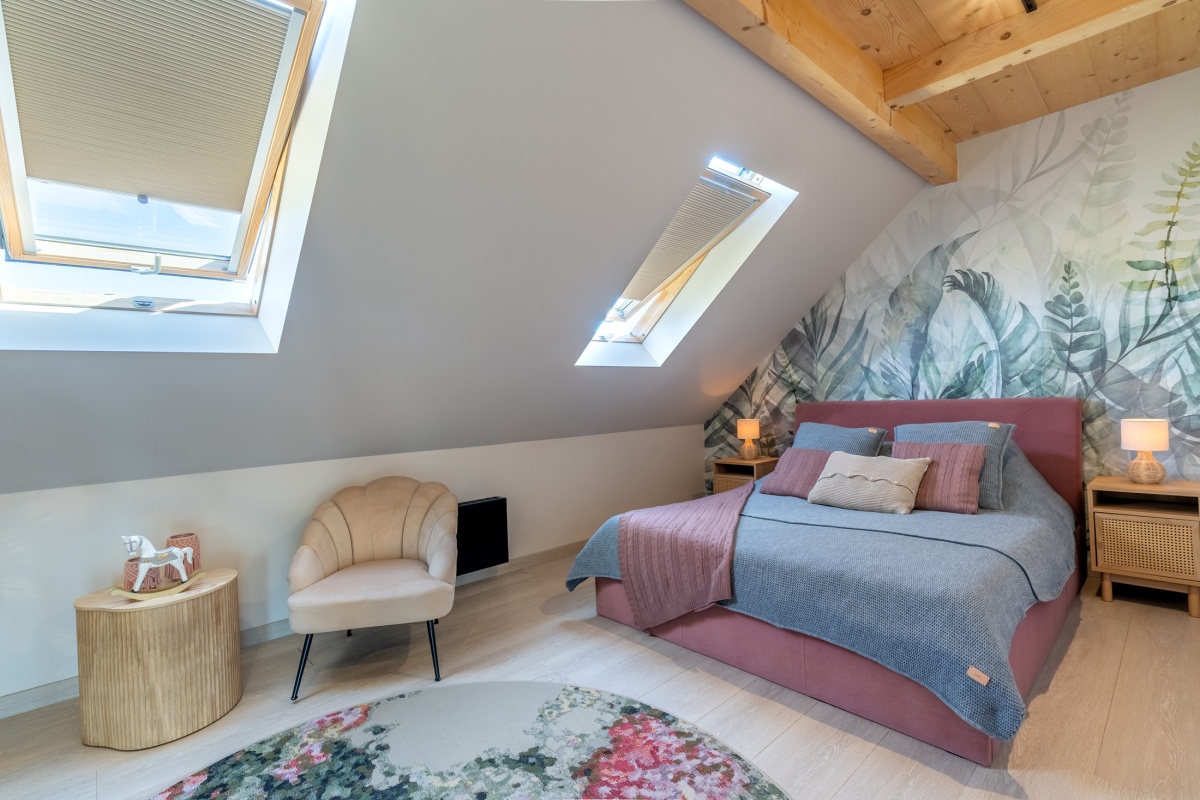 Na piętrze znajdują się trzy sypialnie, łazienka z prysznicem oraz WC.