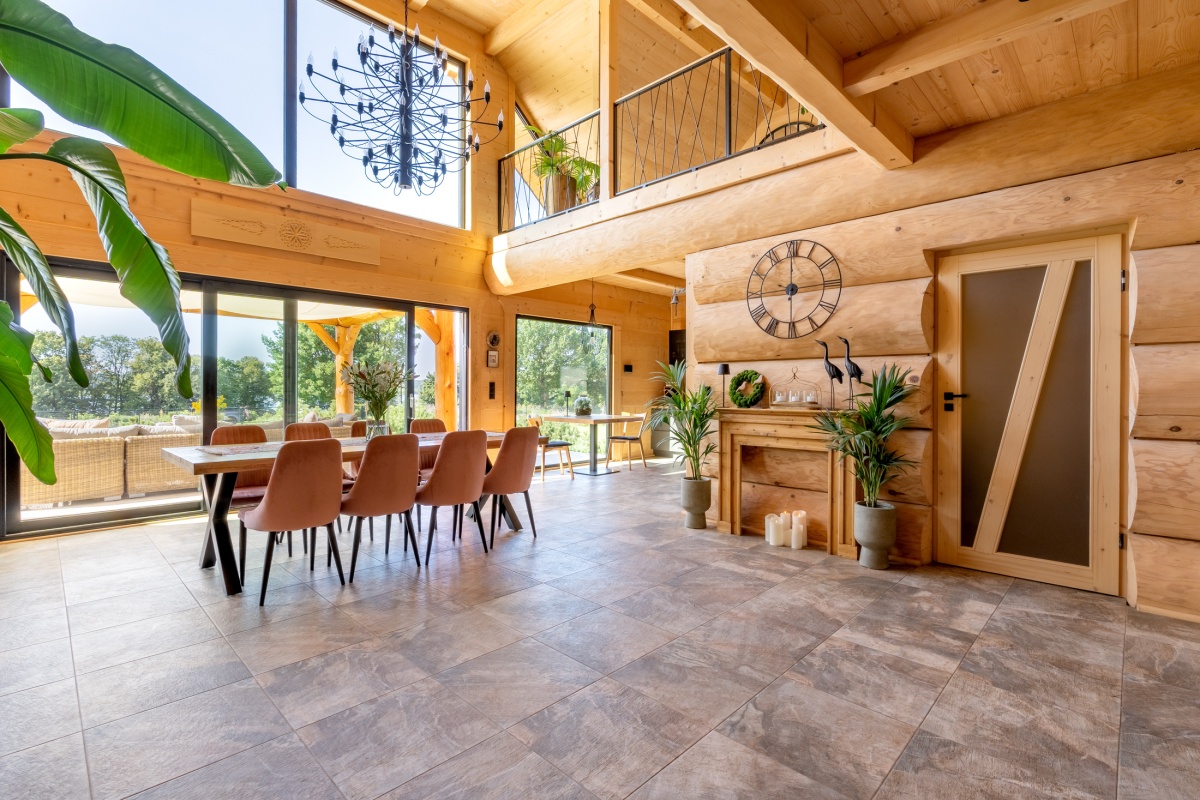 Obok domu, na drewnianym podejście, umiejscowiona jest strefa SPA wyposażona w 8-osobowe jacuzzi z hydromasażem opalane drewnem, saunę dla 8 osób również opalaną drewnem oraz drewnianą balię z zimną wodą.
