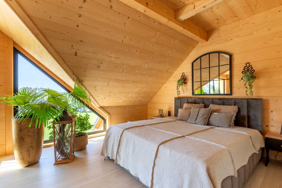 Cały front domu to wielkie przeszklenia, przez które roztacza się imponujący widok na jezioro i otaczającą zieleń. Przed domem znajduje się 50 m2 zadaszony taras z widokiem na jezioro wyposażony meble tarasowe zachęcający do niekończącego się relaksu i wypoczynku.
