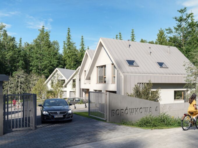 Działka jest ogrodzona czarną siatką i posiada dwie bramy wjazdowe: z przodu bramę automatycznie otwieraną z wideodomofonem oraz z tyłu zwykłą bramę wjazdową.