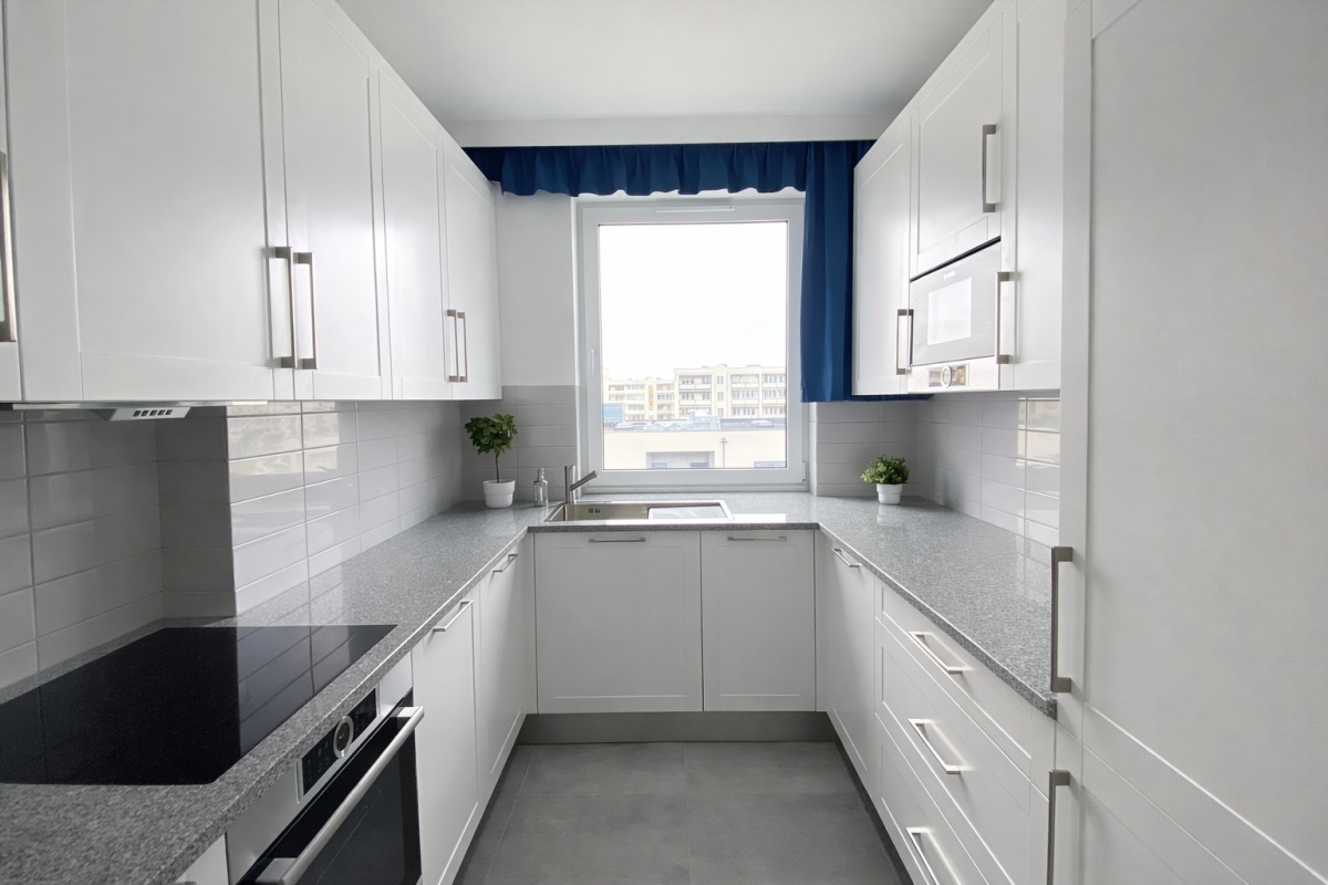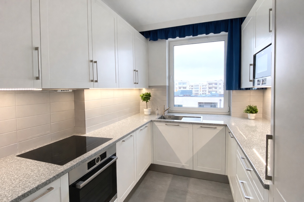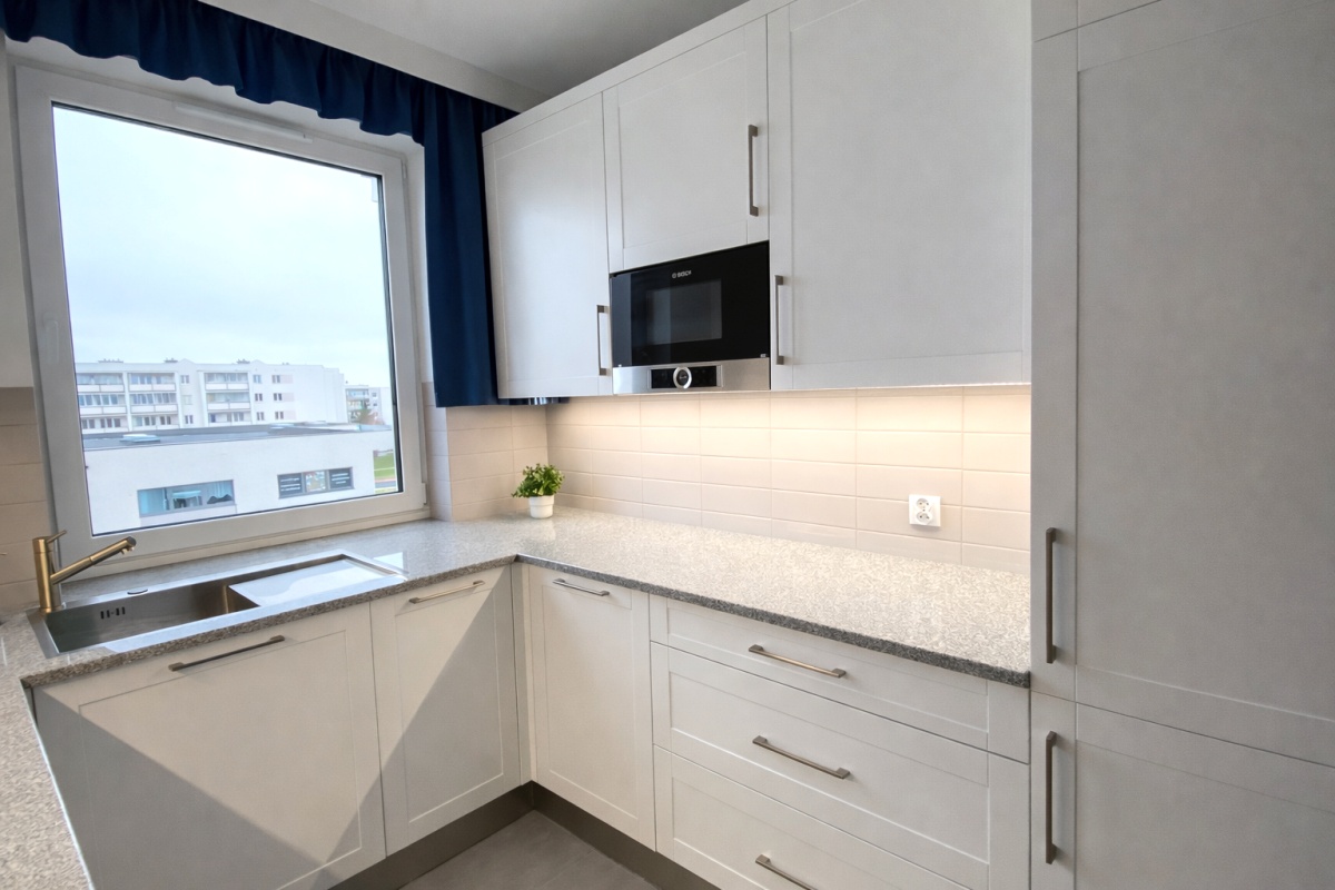 2) KUCHNIA: blaty z szarego granitu, wyposażenie AGD w zabudowie, tj.: lodówka z zamrażarką, płyta indukcyjna, mikrofala, piekarnik, zmywarka, zlewozmywak z ociekaczem – wszystkie sprzęty BOSCH,