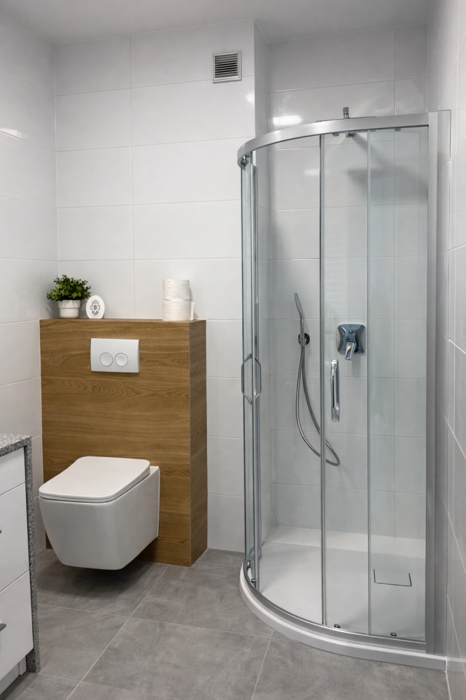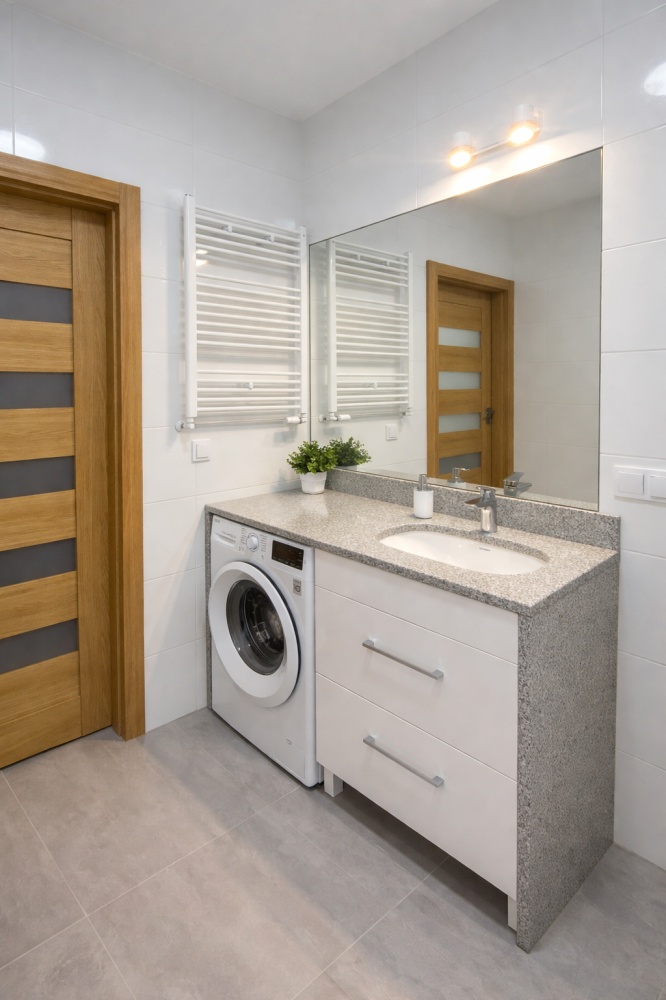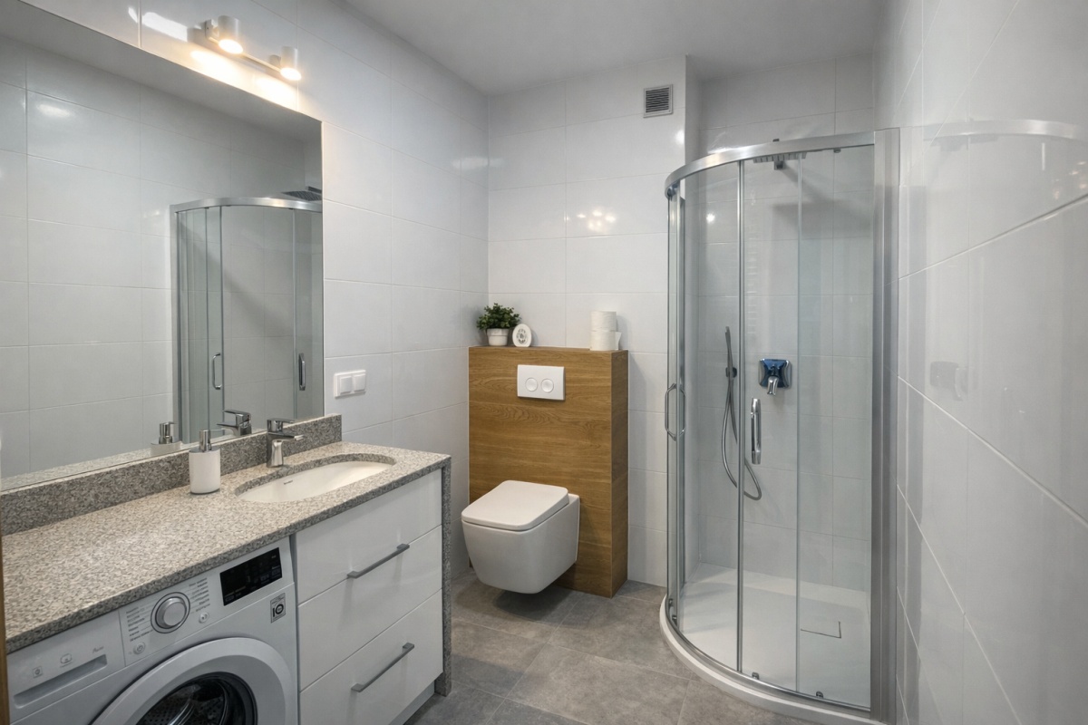 1) ŁAZIENKA: , toaleta z funkcją bidetu, umywalka i pralka LG osadzona w zabudowie z szarego granitu, kabina prysznicowa 80×105, pralka,