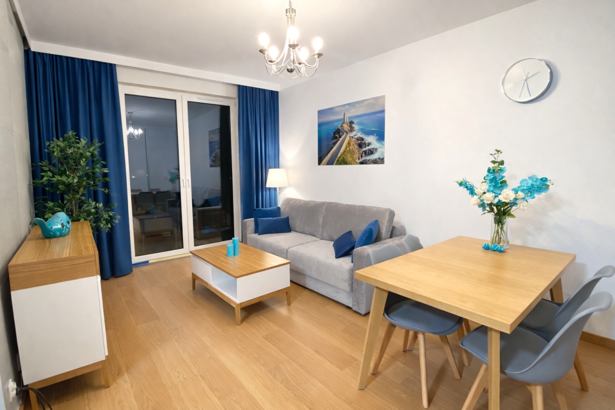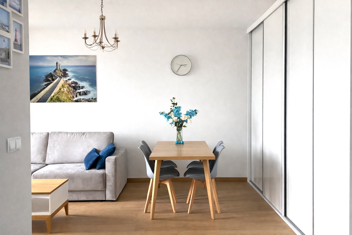 3) SALON: wygodna 4osobowa sofa z funkcją spania o pow. 150×200, komoda pod TV, szafa z drzwiami przesuwnymi 4-drzwiowa, nowoczesny stół 80×140, 4 krzesła,