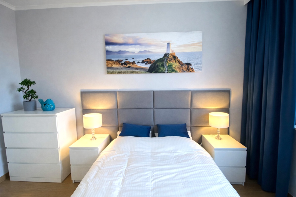 5) sypialnia: łóżko szer. 140cm, komoda, 2 szafki nocne